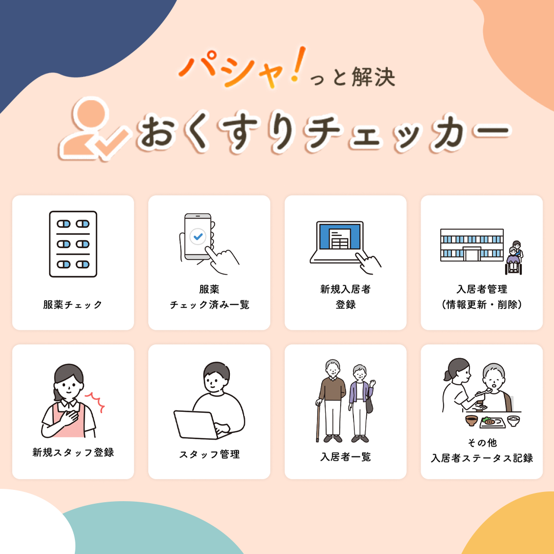 介護施設スタッフ、施設利用者、薬剤師の皆様にやさしく、便利な服薬管理システムとして、おくすりチェッカーはさらに進化していきます。